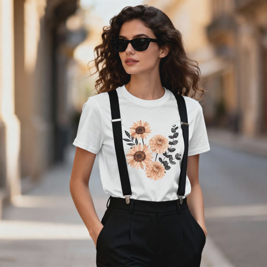 A beautifully composed floral design featuring soft neutral sunflowers and dahlias, blending vintage tones with a modern minimalist layout. This elegant graphic tee adds a warm, earthy touch to any outfit and is perfect for nature lovers, floral styling, and anyone who appreciates gentle botanical artwork.